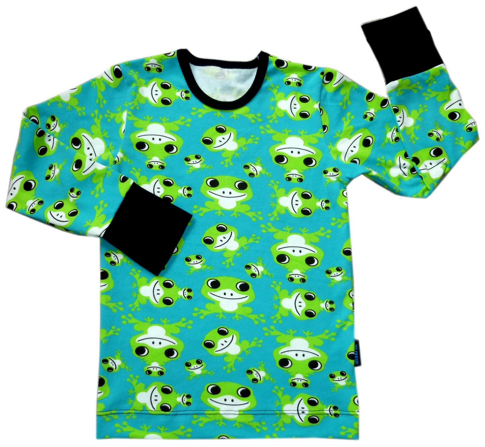 Idag slutförde jag tröjan. Tog interlock istället för jersey till bandkantning och valde att använda tre lager istället för fyra - funkade utmärkt när jag fick sitta hemma i lugn och ro ;) Och så fållade jag med hjälp av syguiden, vilket kändes lite knöligt. Jag längtar efter fållguiden som är det enda som saknas i min beställning från Skövde symaskiner. Tröjan ser väldigt lång och smal ut, så vi får se hur den passar på makrillen. Men så är det ju när man syr utifrån mönster man inte är bekant med. Turkos grodor från Znok. Svart jersey och svart interlock från Jny. Tycker den blev fin!